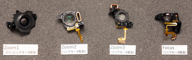 主要レンズ群。3つのズームレンズ群のうち2つの群とフォーカス群の駆動にはリニアモーターを採用し、ズーム/フォーカス時の静音性が大幅に向上