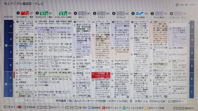 ZT2200の番組表。白バックに黒い文字、淡いジャンル別表示の色彩など見やすい画面に仕上がっている。番組を選択するとセルの中に比較的詳しく番組情報が表示されるほか、番組表のすぐ下にある横一列のボックスにまた詳しい番組情報が表示される