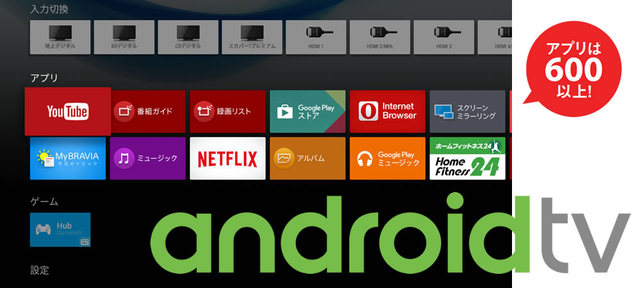 ソニーは4Kブラビア全モデルに「Android TV」機能を搭載。Android TVアプリと専用にカスタマイズされた独自の機能により、様々なコンテンツが簡単操作で楽しめるのはブラビアだけ。料理やフィットネス、音楽、ゴルフなど、様々な趣味・ライフスタイルに合わせた、600以上に及ぶアプリが用意されている