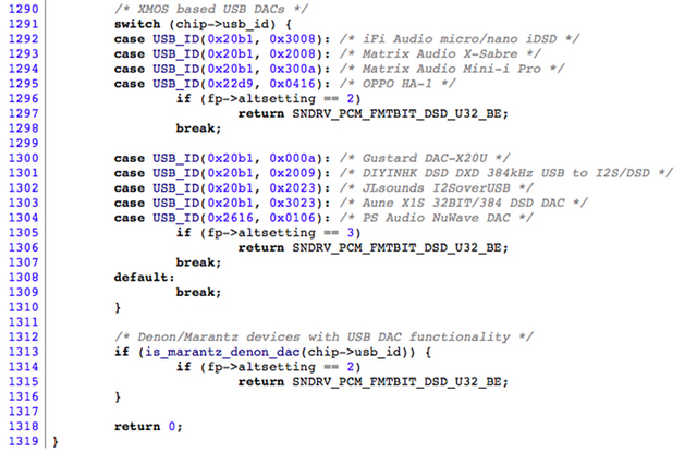 カーネルのソースコード(quirks.c)を見ると、DSDネイティブ再生が可能なUSB DACのベンダーIDを確認できる