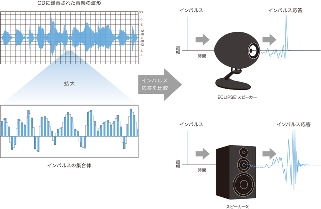 インパルス応答を軸に、ECLIPSEスピーカーと一般的なスピーカーのちがいを示す概念図。ECLIPSEの「正確な音」を正しく説明するためには、音響への理解も必要となる