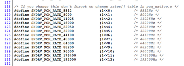 LinuxカーネルのPCM入力について定義するヘッダファイルの一部。最新安定版(v4.6.2)ではサンプリングレートが最大192kHzとされている