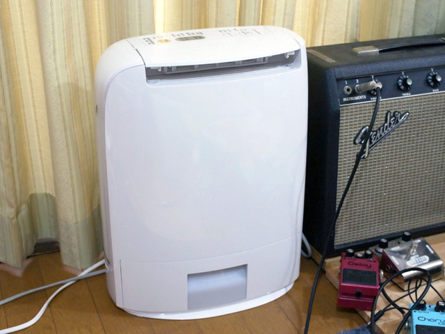 単体の除湿機。エアコンの冷房とは逆に、湿度を下げる代わりに室温は上昇させてしまう。ギターアンプで生活感の中和を図ってみた
