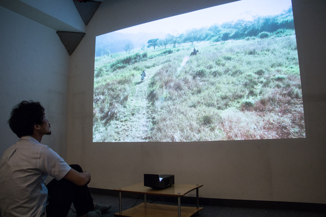 試聴室の壁にPF1000UGから100インチの映像を投写したところ