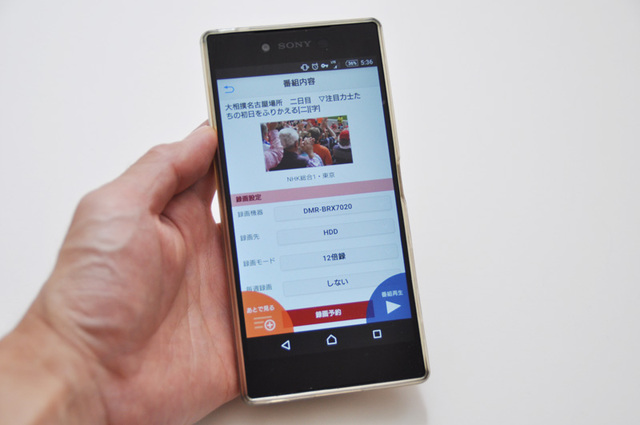 番組詳細の画面。番組再生、あとで見る、番組予約や保存のメニューに素速くアクセスできる