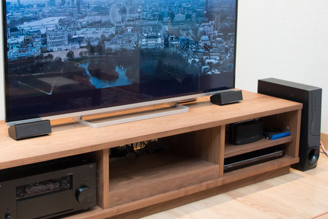 スピーカーをテレビ前に、サブウーファーをラック脇に縦置きして設置したところ。テレビ前の中央スペースを完全に空けられる