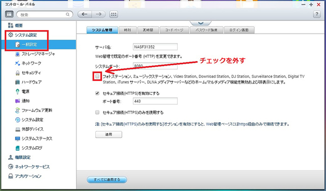 「コントロール・パネル」→「システム管理」→「一般設定」と入り、赤枠で示したボックスのチェックを外す