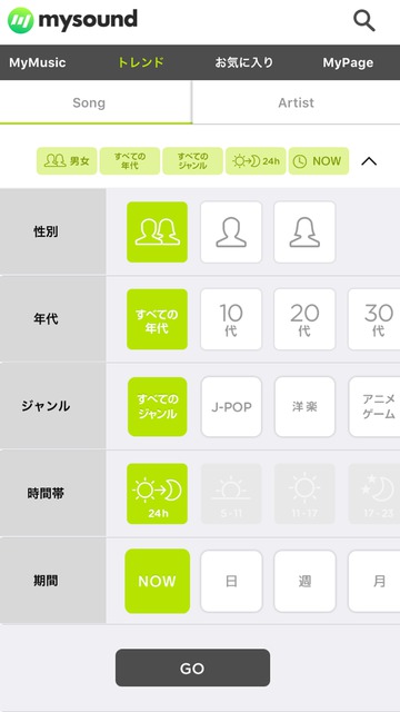 年齢層や楽曲ジャンルを始めとした様々な条件でランキングをソート可能