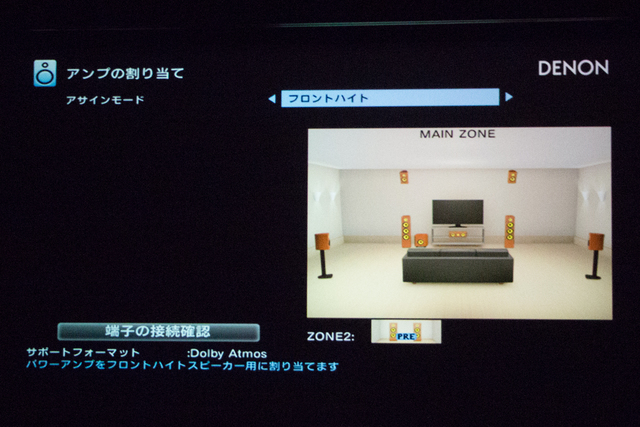 本機の自動音場補正の画面。アトモスは5.1.2に対応。トップスピーカーの柔軟なアサインが可能であることも特徴だ