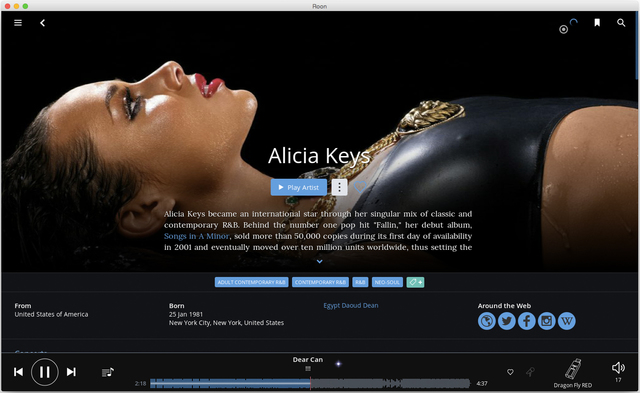 Alicia Keysのアーティスト画面。アルバムや楽曲の表示はもちろん、バイオグラフィー、関連アーティスト/作品の表示やライブ情報に至るまで、豊富な情報が(当然だが全て英語で)表示される