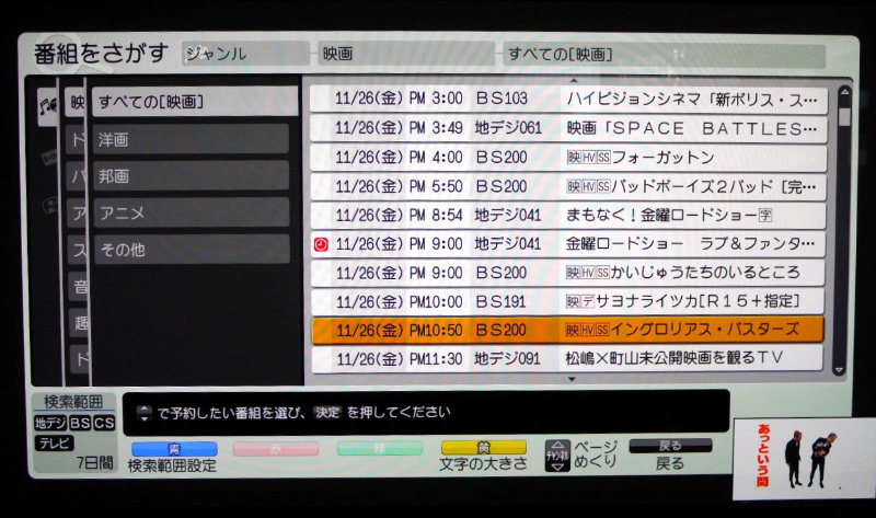 「ジャンル」による検索は、向こう一週間の決まったジャンルの番組を一覧で確認できます