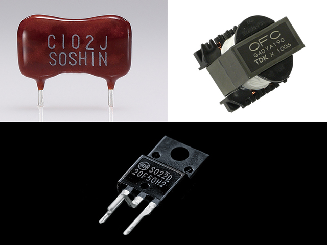 UB900には、UBZ1にも採用されている高音質パーツを注入。ルビーマイカコンデンサ(写真左上)やOFC電源トランス(写真右上)、大容量スイッチングMOSFET(写真下)などを搭載することで、引き締まった力強い低音とノイズレス・ワイドレンジなサウンドを実現した
