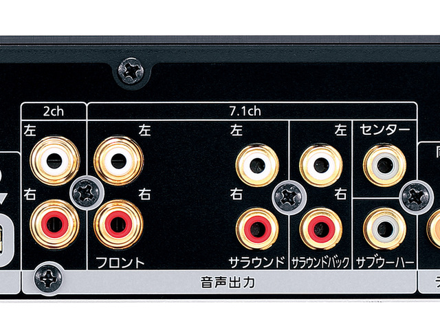 HDMI 2系統出力に加え、7.1chのアナログ音声出力を搭載。192kHz/32bitのDACを5つ採用し、高品位なDA変換とアナログ出力を可能にした