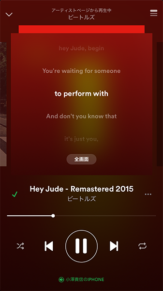 楽曲を再生しながら、ジャケットを軽くスワイプすると歌詞が表示される。現在再生されている部分が白く表示される