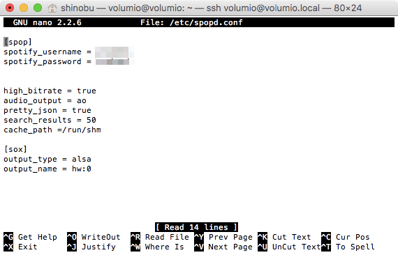 Raspberry Pi ZeroにSSHでリモートログイン、テキストエディタ「nano」でspopの設定ファイルを編集した