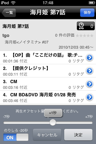 タグラーユーザーの仲間がつくったタグリストを保存する。「±7秒」で全チャプターの再生位置をオフセット調整できる
