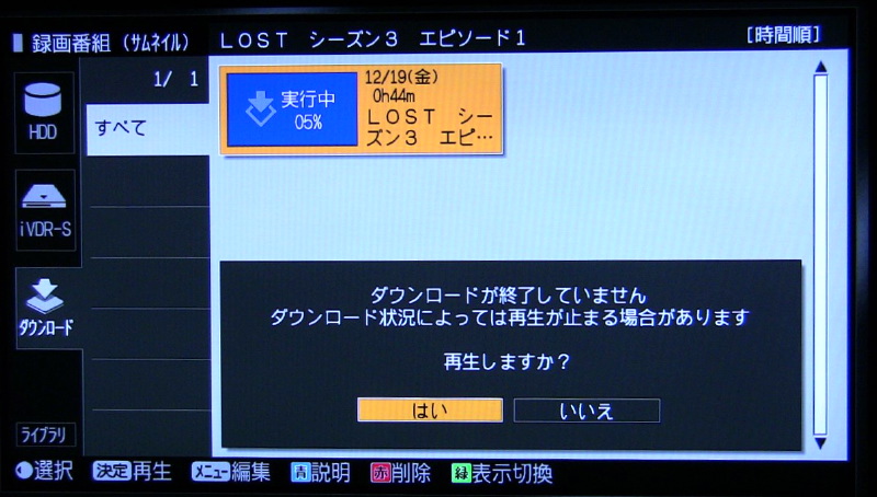 この番組はダウンロード中でも再生をスタートできる。1話の43分14秒(3.2GB)のダウンロードはBフレッツマンションタイプの回線環境で約12分程度だった