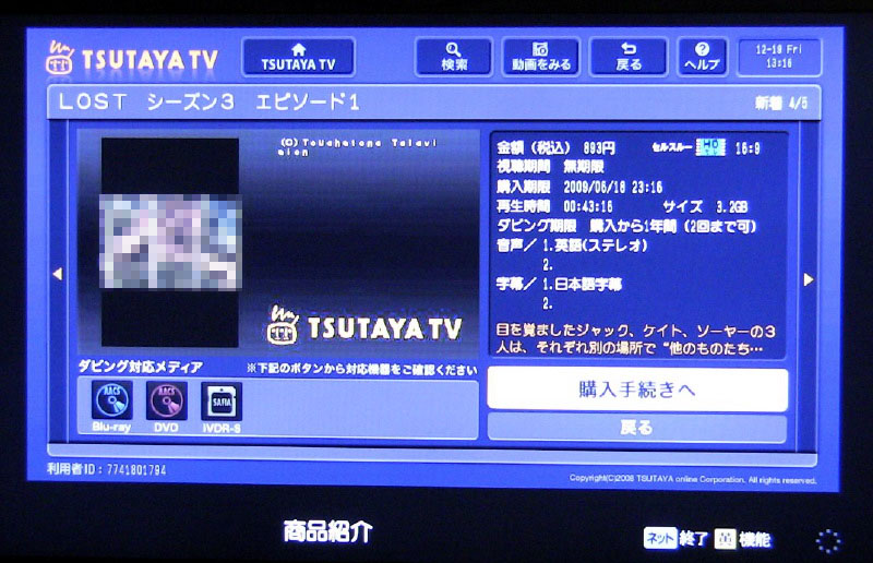 「LOST シーズン3 エピソード1」の購入手続きに進んでみる。43分14秒で3.2GBとある。左下のエクスポート可能メディアにはBD、DVD、iVDR-Sのアイコンが並ぶ