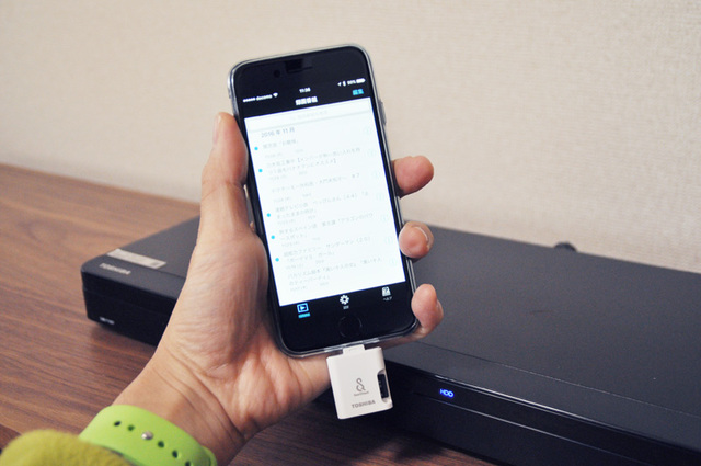 iPhoneにLightning端子仕様のカードリーダーを装着したところ。SeeQVault PlayerアプリにSDカードに保存された持ち出し番組が表示される