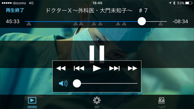 SeeQVault Playerの番組再生中画面。自動チャプターも引き継がれる。画質はレグザブルーレイの設定内容に依存する