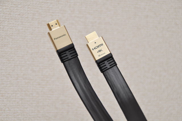 パナソニックのプレミアムグレードのHDMIケーブル、RP-CHKXシリーズを用意した。平型でコネクターも強靱。ずっしりとした手応えだ