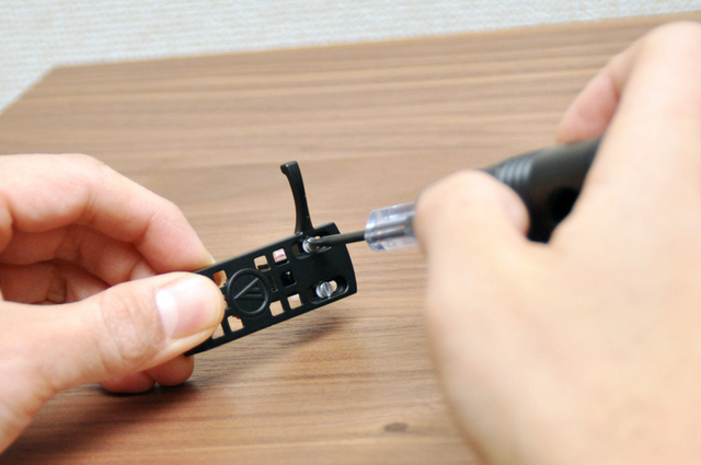 ヘッドシェルからカートリッジのボディを外すときにはマイナスドライバーを使用。リード線は慎重にピンセットなどを使って外した