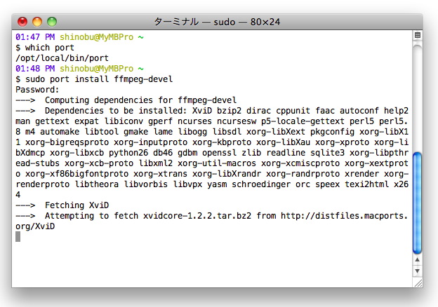 Macの性能にもよるが、ffmpegのコンパイルには1時間近くを要する