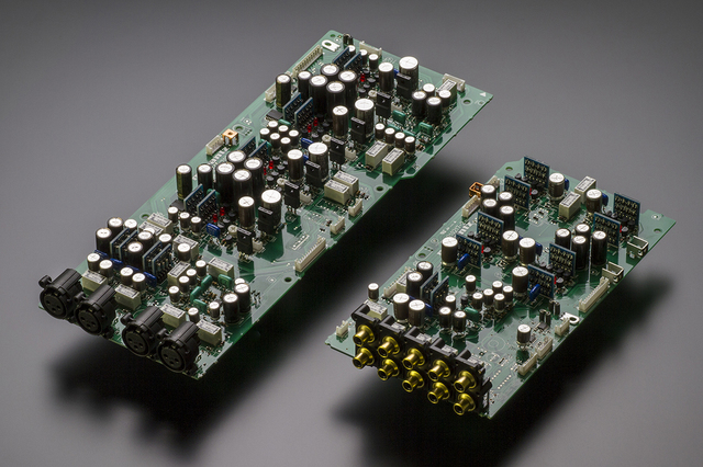PM-10のプリアンプ基板。写真左が最上段のXLRバランス入力基板、右側がRCAアンバランス入力基板となる