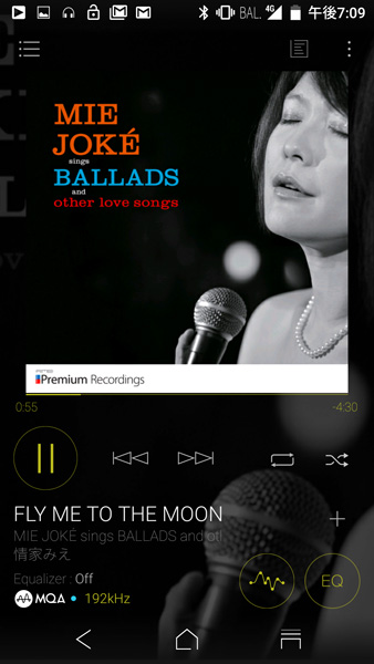 MQAの音源を再生すると再生画面の左下にロゴと青いインジケーターが点灯する