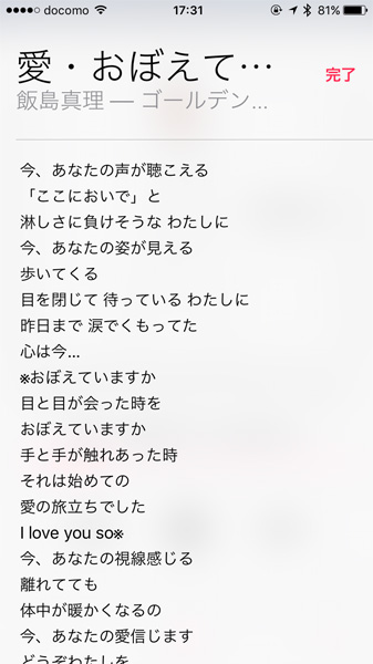 iOS版は音楽配信サービスの時流に乗って歌詞表示の機能を搭載した