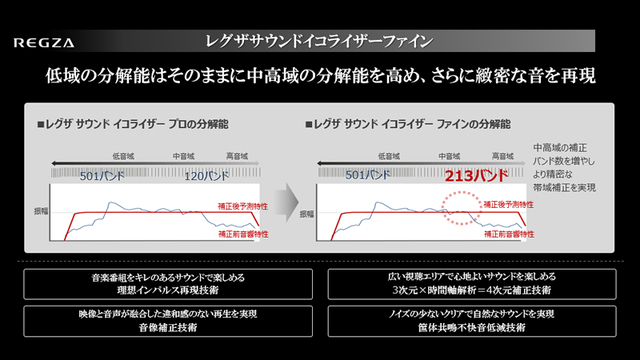 サウンドイコライザーは中高域の補正バンド数が従来の120バンドから213バンドへ大幅に増加