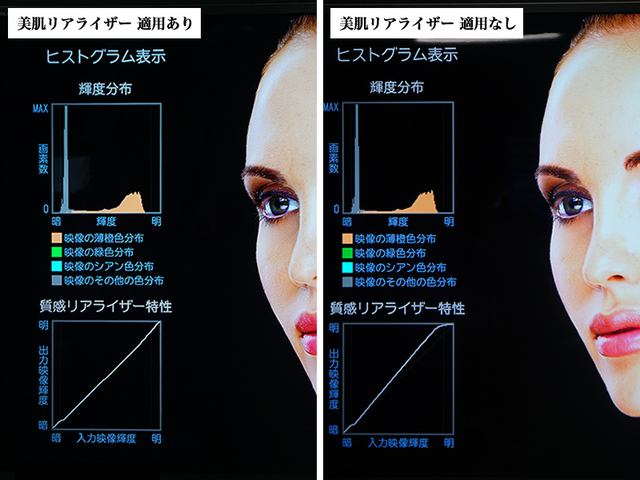 美肌リアライザー適用の有無による特性の違い。質感リアライザー特性のグラフにおいて、適用なし(右)では最明部のグラフ線が寝てしまっているのに対し、適用あり(左)ではキチンと立っている