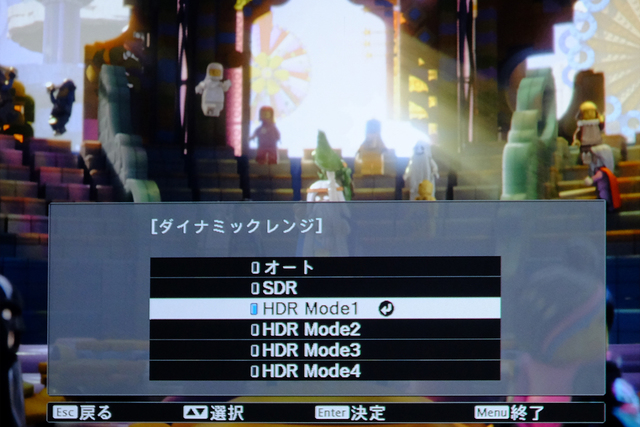 HDRのモードによる階調表現の差。HDR Mode1では外の光が差し込む箇所が多少白飛びするもののピュアな発色が得られる。一方でHDR Mode2では、明るさが適切に抑えられ、外の風景が確認できる