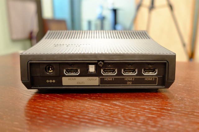 WirelessHDトランスミッターの背面部にはHDMI入力を3系統、HDMI出力と光デジタル出力を各1系統備える