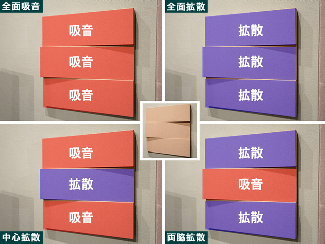 吸音素材と拡散素材の組み合わせが異なる4タイプを用意。外見はどれも同じなので異なるタイプを組み合わせて複数使いした場合でもデザイン面を統一できる