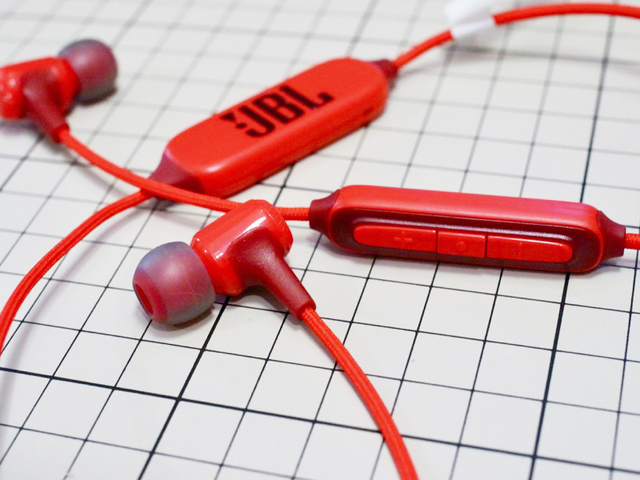 というわけでJBL「E25BT」をサンプルに見ていく。「JBL」ロゴが際立つユニットについて後ほど触れていく