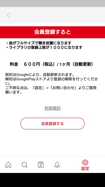 Android版の契約画面。こちらはGoogleによる自動更新で、登録解除はGooglePlayストアから手続きを行う