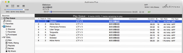 MQA-CDからリッピングしたAIFFファイルを、Audirvana Plus 3で再生したところ。音源のスペック(右上)には「16/44.1kHz」と表示。DACへの出力(左上)は「32/44.1kHz」と表示されている。DAC出力が32bitとなっているのは、本文にもあるとおり、DACの対応するbit幅を示しているだけだ