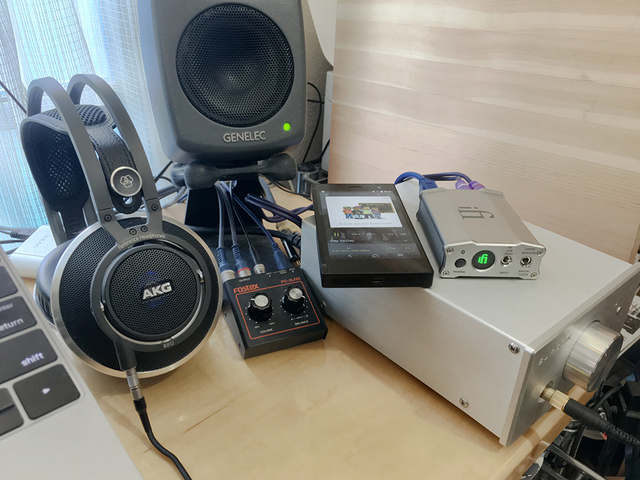 筆者の自宅での試聴の様子。nano iOneはUSB電源アダプターも付属するので、さまざまなシチュエーションでの使用が可能だ