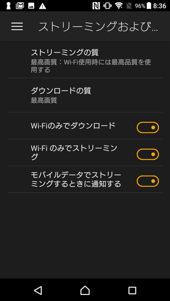Amazonプライム・ビデオの設定画面。動画ストリーミングとダウンロードの画質、さらにはWi-Fi接続時にのみストリーミングやダウンロードを許可するかなど細かな設定ができる