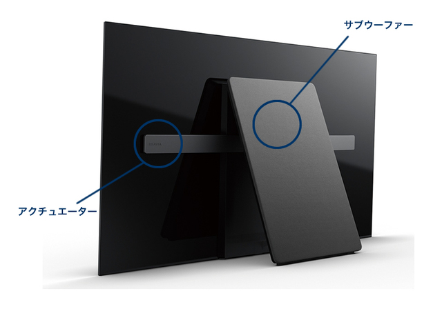 映像から直接、音があふれだす「アコースティック サーフェス」。テレビ背面に左右2個ずつ配置された「アクチュエーター」により、有機ELパネルそのものを振動させることでステレオ再生を実現。スタンド部にサブウーファーが内蔵されており、迫力の2.1chサウンドが楽しめる。S-ForceやDSEEも搭載。セリフが画面中央から繰り出され、アクションシーンも左右の移動感を驚くほど正確に表現。音が映像と一体化し、臨場感を高める