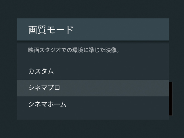 おもにHDRリマスターの効果が得られる「カスタム」モードで視聴。そのほか、映画スタジオでの編集環境に準じた映像を再現する「シネマプロ」や「シネマホーム」を画質モードに用意。視聴環境にあわせた最適な画質が得られる「明るさセンサー」も搭載する