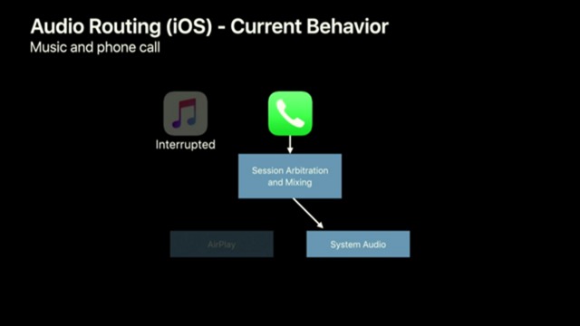 従来のiOS。着信があると、電話アプリが音楽再生アプリに割り込む形で処理されるため、音楽再生が途切れていた