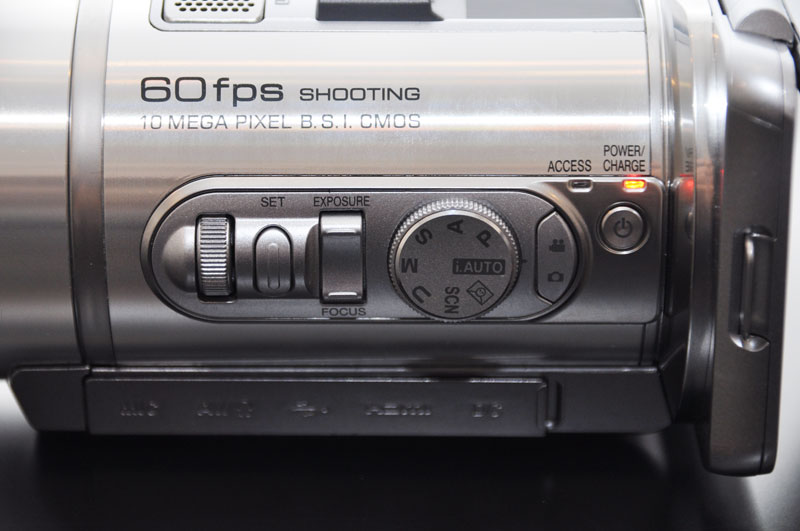 円筒状のレンズ部側面に、本体電源、動画/静止画切り替え、モードチェンジダイアルなどボタン類を配置している