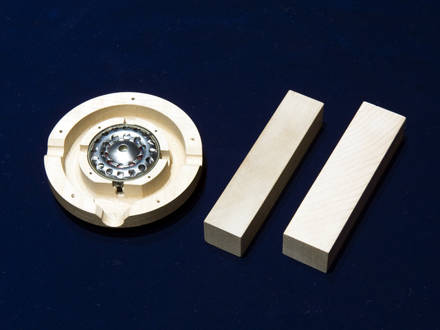 北アメリカの水路の底に眠る14世紀の希少木材を引き上げたアクアティンバー材を使用。通常のメイプル材(右)よりも木目が詰まっていることなどが分かる