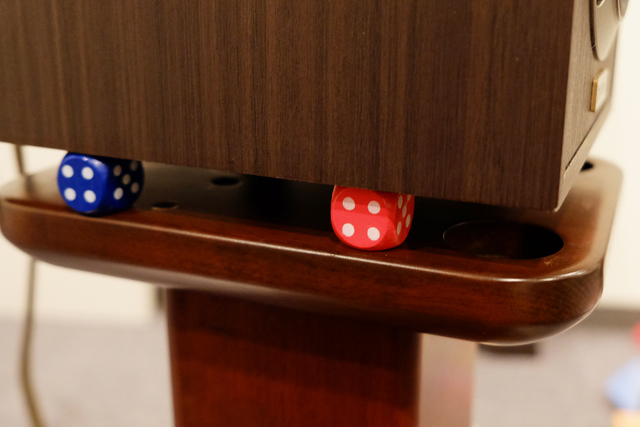 角に置けないときは、スピーカーの端ギリギリに設置。なお、サイコロの目はすべて6を上にしてみた
