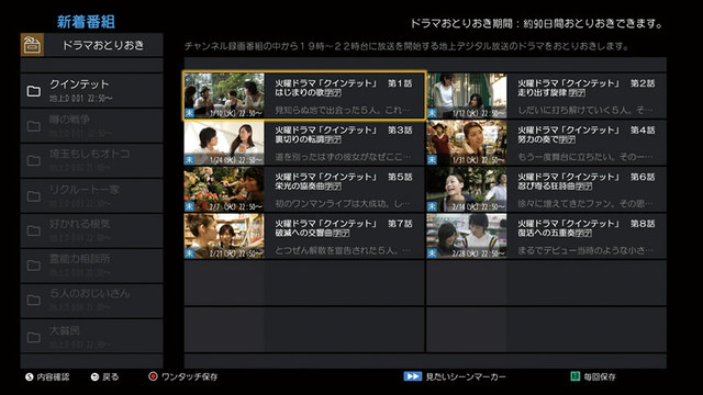 予約しなくても自動で録画してくれる「チャンネル録画」に対応。最大10ch×28日間の全録ができるほか、新たにゴールデンタイムに放映される地デジのドラマをシリーズごとにまとめ、約90日間保存してくれる「ドラマおとりおき」機能も搭載した