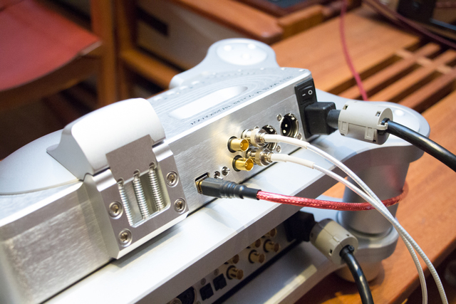 背面端子。DAVEとは2本のBNC同軸ケーブルを使って接続することで、最大768kHzの伝送が可能となる
