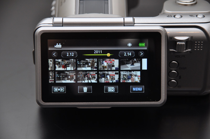 動画・静止画ともに撮影したデータが一覧表示でき、タッチ操作で見たいファイルを選択再生する。ページ送りは画面をタッチしながら左右にスワイプして切り替えられる