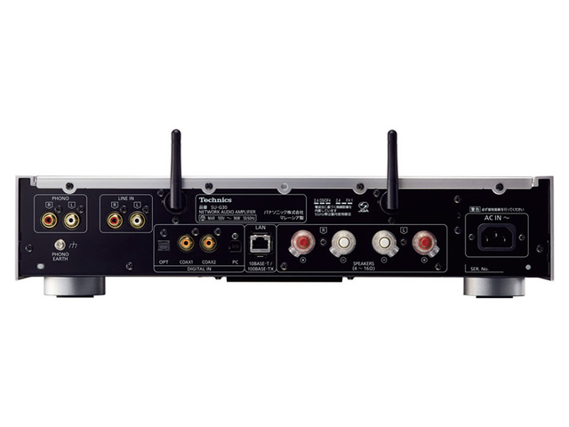 リア部。アナログ入力はLINEとPHONO(MM)が各1系統。デジタル入力は光、同軸(RCA)、USB-B、LAN端子を装備。スピーカー出力は1系統でバナナ端子も対応